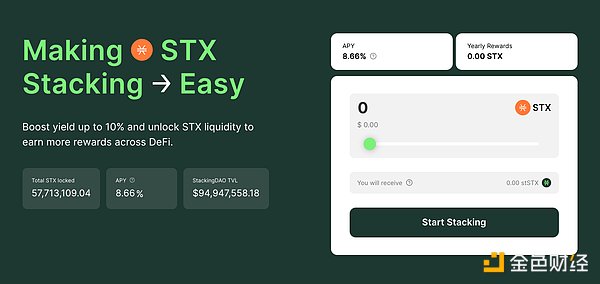 StackingDAO是一個Decentralization應用程序(dApp),為Stacks上的Stacking過程提供流動性質押服務。與其他流動性質押服務類似,用戶可以將自己的STXTokens存入StackingDAO,參與Stacking進程,并通過獲得stSTX的衍生Tokens,賺取約8%(基準為7%)的年收益率(APY)。