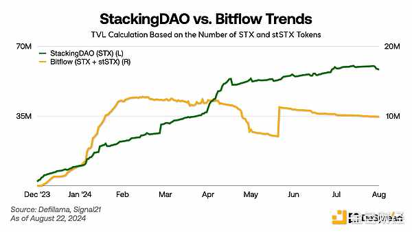 StackingDAO作為Stacks生態系統中的第一個流動性質押dApp,在推出后不久就達到了近1.25億美元的TVL峰值。盡管市場出現調整,StackingDAO的TVL仍保持在8,000萬美元左右,是Stacks生態系統中資金量最大的dApp。