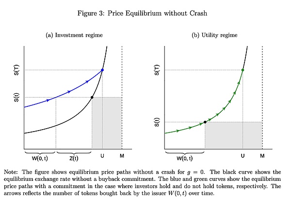 在分析均衡結果之前,文章提供了市場清算條件的圖形表示。圖2展示了市場清算條件的機制,其中給定的X$(t)值由圖中的陰影矩形表示。向上傾斜的曲線代表了用戶向投資者和交易平臺提供Tokens的供給曲線。投資者和交易平臺持有的Tokens總量為W(0,t)+Z(t),用戶則持有剩余部分,即MW(0,t)Z(t)。用戶保持的美元余額為X$(t)。如果匯率上升,用戶愿意提供更多的Tokens,因為他們需要較少的Tokens來維持相同的美元余額X$(t)。這導致了匯率與投資用途Tokens數量之間關系的向上曲線。