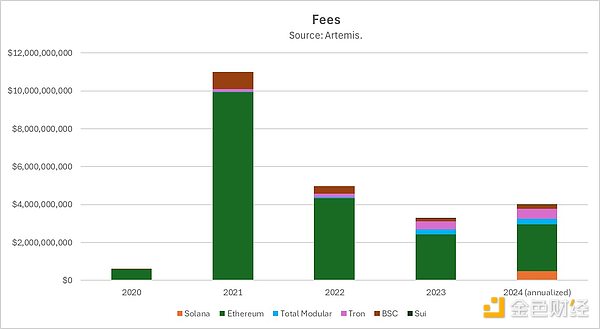 如果把Ethereum及其模塊化生態(tài)的市值加在一起看,情況會發(fā)生變化。2023年,Ethereum模塊化基礎(chǔ)設(shè)施Tokens產(chǎn)生的價值與整個Solana的價值差不多,都是500億美元。但在2024年,這些Tokens的整體表現(xiàn)不如Solana。此外,這些Tokens的收益主要歸團(tuán)隊和早期投資者所有,而非ETHTokens持有者。