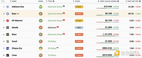 L2的TVL排名,來源:L2beat,2024/10/31