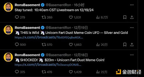 而UFD的敘事完美結合了Fartcoin的熱度,又增添了諷刺意味。一位54歲的擁有白銀和黃金投資頻道的YouTuber貴金屬投資者在看到Fartcoin市值達到5億美元后,決定創建自己的meme幣UnicornFartDust「獨角獸屁塵」,作為對Crypto的社會實驗,以驗證Crypto是否是有價值的資產。之所以選擇Unicorn,有網友推測是因為馬斯克之前為特斯拉畫了一幅「放屁的彩虹獨角獸」。