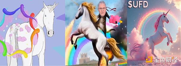 許多人截取了Ron放在推特和YouTube上的直播視頻片段,用AI生成他和彩虹屁獨角獸的互動,還有各種彩虹屁獨角獸的視頻、動圖、表情包等,他們不斷在社交媒體上宣傳,表現出對于UFD的信心和期待,展示社區的創造力和熱情,形成一種信心共識。社區將彩虹屁獨角獸的形象與UFD的內涵和當下流行的AI結合起來,更貼合熱點與潮流,推動UFD進一步出圈,讓更多的人了解并參與到UFD交易中來。