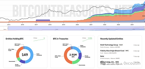 這些持有Bitcoin的主體中,73家是上市公司,18家私企,11個國家,42個ETFs或Funds,5個DeFi協議。