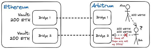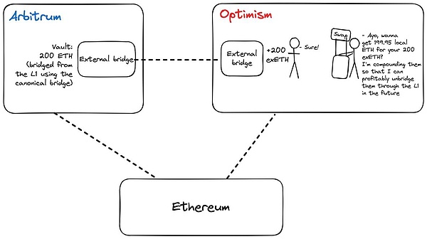 追求效率的Rollup用戶必須使用其他跨鏈橋提供商,這些提供商可以承擔(dān)待處理的Rollup退出的所有權(quán),并在用戶期望的目標(biāo)鏈上提供即時(shí)流動(dòng)性。當(dāng)此類橋使用傳統(tǒng)的鎖定與鑄幣模型時(shí),我們最終會(huì)得到由不同協(xié)議發(fā)行的Tokens的多個(gè)包裝Tokens,并面臨前文描述過(guò)的相同問(wèn)題。