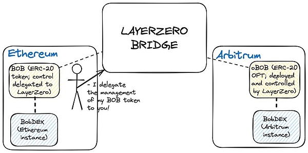 上文關(guān)于提供商鎖定的結(jié)論部分,強(qiáng)調(diào)了使用標(biāo)準(zhǔn)第三方跨鏈橋的另一個(gè)問(wèn)題:Tokens發(fā)行方為了獲得更大的便利性和用戶體驗(yàn)改進(jìn),而犧牲了標(biāo)準(zhǔn)跨鏈Tokens的控制權(quán)。例如,Ethereum上的BobToken完全在Bob的控制范圍內(nèi),因?yàn)樗刂浦讓拥腅RC-20Tokens合約,但Optimism、Arbitrum和Base上的BobToken卻是由LayerZero控制的,后者擁有在這些Blockchain上發(fā)布BobToken標(biāo)準(zhǔn)Tokens的OFT合約。