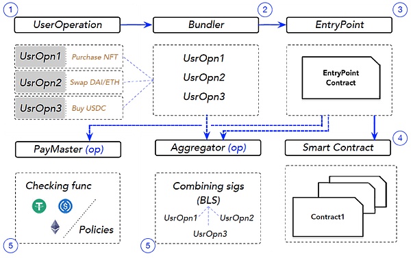 ERC-4337是一個賬戶抽象提案,它在不改變Ethereum核心協(xié)議的情況下工作。相反,ERC-4337創(chuàng)建了一個額外的基礎(chǔ)設(shè)施層,圍繞替代內(nèi)存池進(jìn)行中心化。該層允許智能合約驗(yàn)證、執(zhí)行和與UserOperations交互。這些特殊的類似交易的對象使智能合約能夠成為主要賬戶。同時,Bundlers處理它們的收集、聚合和提交到Blockchain。