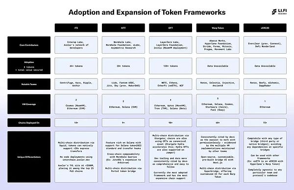 Circle為USDC提供的獨特功能集是因為他們自建的橋接協議CCTP,這是大多數項目所沒有的奢侈品。這就是由互操作性協議維護的Tokens框架發揮作用的地方。這些框架提供了類似于CCTP為USDC提供的解決方案,但適用于任何Tokens。通過這些框架發行Tokens,項目可以在多個支持的鏈之間創建統一市場,便于使用燒/鎖定和鑄造機制進行簡單轉移。