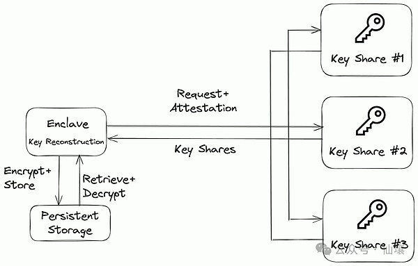 即TEE將相關(guān)交易分別交給不同的MPC服務(wù)器,MPC服務(wù)器簽名后進(jìn)行聚合簽名并將交易最終上鏈。這種方法的靈活性要低得多,不能用于保存API密鑰、密碼或任意數(shù)據(jù)(沒有受信任的第三方存儲(chǔ)服務(wù))。