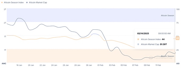 BTC主導指數:截至2月14日,當前BTC主導指數為59.8%,較1月上半月的55.7%,上漲4.1%。