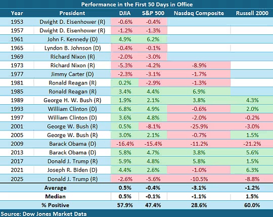 歷史表明,在總統(tǒng)任期的前50天,美股往往會下跌。自1953年以來,標(biāo)普500指數(shù)在此期間的平均回報率為負(fù)0.4%,而納斯達(dá)克指數(shù)在這50天內(nèi)的平均跌幅為3.1%。