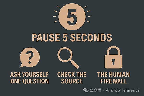 只要有人要求你輸入助記詞、點擊鏈接、下載軟件、或自稱權(quán)威身份時——你就強制停下,數(shù)5秒鐘。
