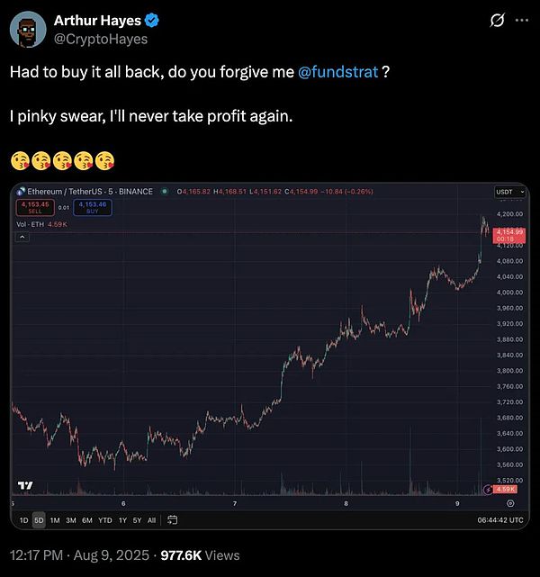 同月早些時候,他以宏觀經濟擔憂為由,在Ethereum價格接近3500美元時賣出了832萬美元的Ethereum。當ETH反彈至4150美元以上時,他重新買回,并在社交媒體上承認:“不得不全部買回來。我發誓,我再也不會獲利了結了?!?/p>