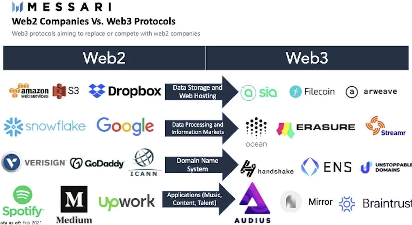 在Web3.0中,有Sia、Filecoin、Arweave等分布式存儲協(xié)議,有Ocean protocol、Streamr、Erasure等數(shù)據(jù)處理協(xié)議,比較成熟的ENS、TNS、Handshake等域名系統(tǒng),支付工具有Metamask,內容分發(fā)平臺有Mirror等,Decentralization社交工具有TG與Discord等等,可以認為Web3.0協(xié)議已經(jīng)初具形態(tài)。