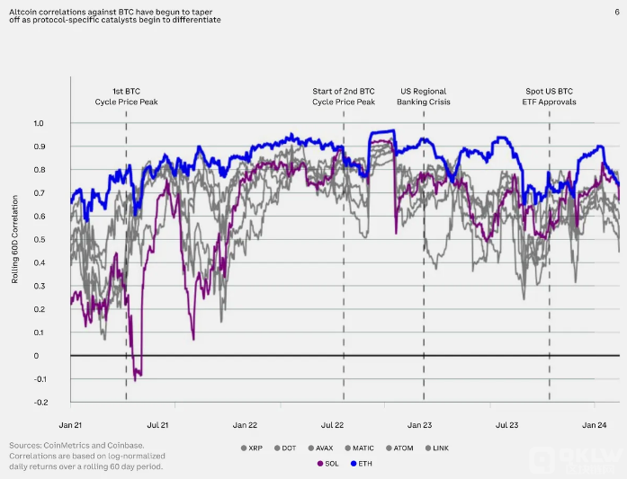 該指數對于確定市場是否過熱或低估至關重要,提供有關投資者利潤和市場調整可能性的詳細信息。報告指出,第二季度加密資產之間的相關性下降,這一趨勢表明crypto市場正在走向成熟。