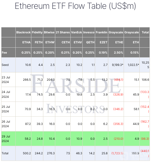 盡管ETHE面臨資金流出,其他幾只EthereumETF卻表現(xiàn)良好。貝萊德旗下的iShares Ethereum Trust(ETHA)獲得了5億美元的資金流入,BitwiseEthereumETF(ETHW)凈流入2.76億美元,富達(dá)Ethereum基金(FETH)則吸引了2.44億美元的資金。