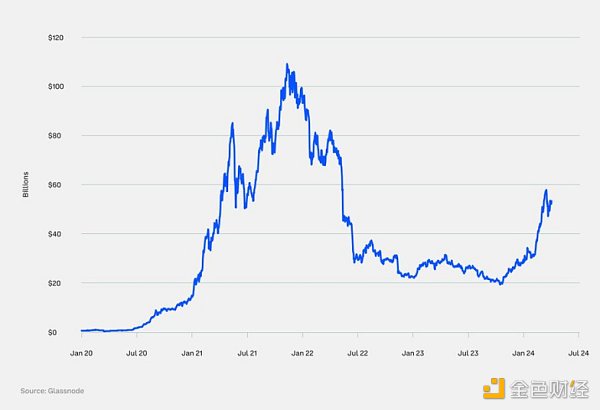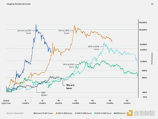 BTC已經(jīng)經(jīng)歷了4輪市場(chǎng)周期,各周期都有自己的牛市和熊市階段。本輪周期始于2022年,BTC價(jià)格較2022年11月的低點(diǎn)上漲了400%。本周期與2018-2022年周期類似,當(dāng)時(shí)BTC價(jià)格較低點(diǎn)上漲了2000%。