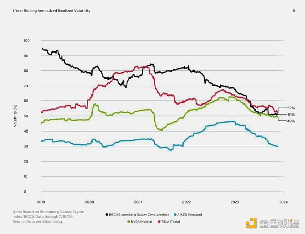 從感知角度講,對(duì)于許多投資者來(lái)說(shuō),數(shù)字資產(chǎn)的波動(dòng)性太大。而現(xiàn)實(shí)情況卻是:crypto的波動(dòng)性與一些被廣泛持有的大型科技股相當(dāng)。