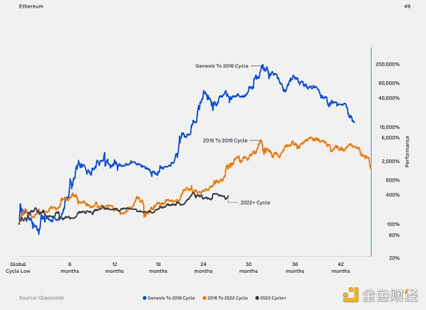 ETH已歷經(jīng)兩個(gè)完整的市場(chǎng)周期。本輪周期始于2022年,自2022年11月以來(lái),ETH上漲了240%以上。本輪周期與2018-2022周期相似,ETH價(jià)格較低點(diǎn)上漲了6000%。
