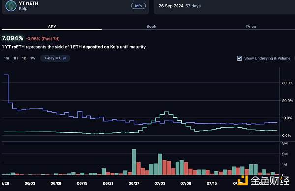 Pendle YT 市場對 LRT WrapETH 資產(chǎn)的定價(jià)區(qū)間已經(jīng)降至 6%~7%。目前,Renzo 的 rsETH 的 YT 最高,但也僅有 7.1%。這個(gè)幣本位收益率水平,已經(jīng)很難吸引 ETH 持有者和空投農(nóng)民冒著本金損失的風(fēng)險(xiǎn)質(zhì)押和再質(zhì)押 ETH。